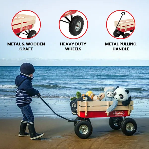 Equipped with large pneumatic tires and a sturdy steel base, our pull along wagon effortlessly transports all your essentials across any terrain, making it easy to pull for any age.