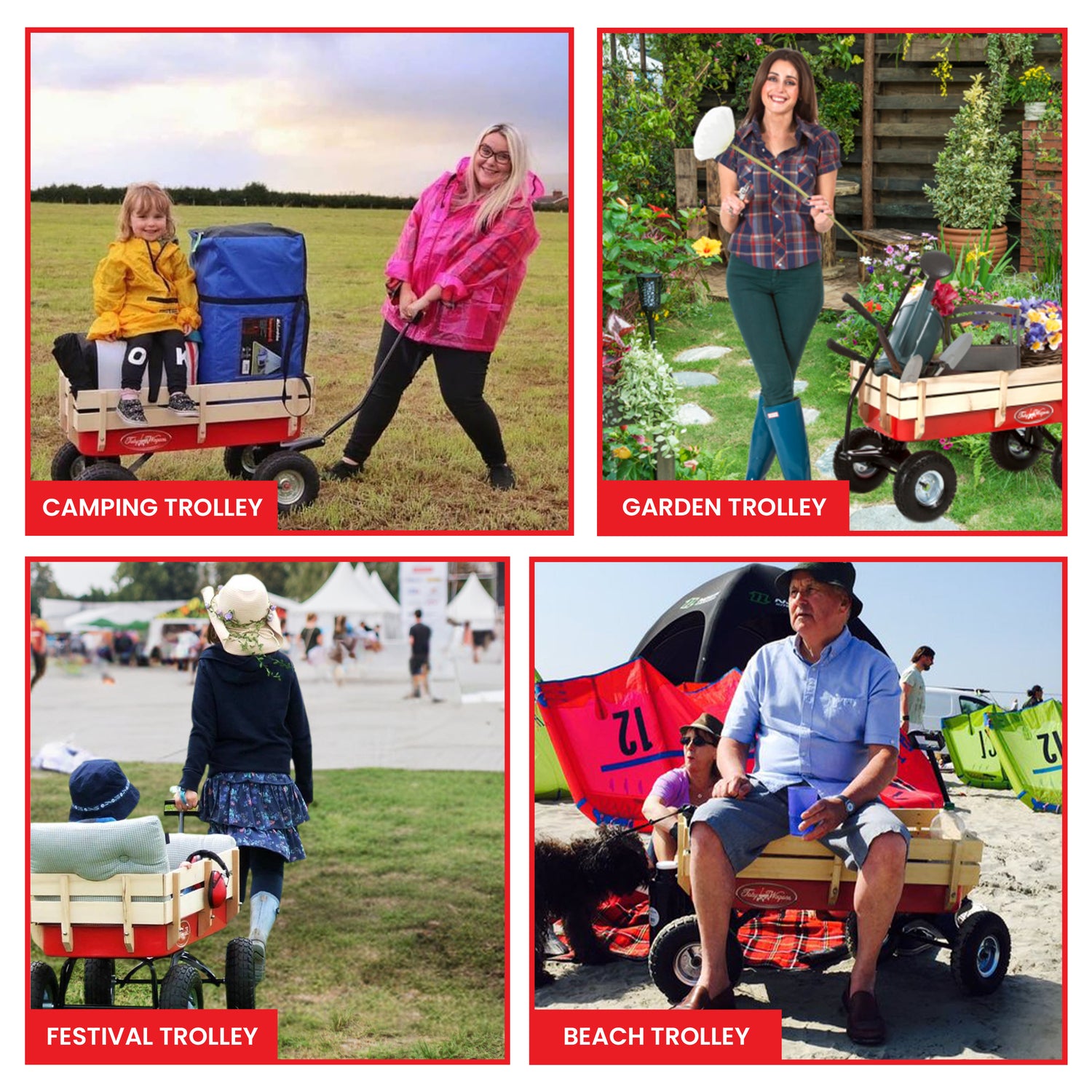 "I got an All Terrain Wagon and a foldable one 8 years ago. Foldable died a death early on, Red Wagon still going strong. The kids have commandeered it though. Wheels have never needed attention, it rocks! Best investment I ever made. I have bought and sold three cars since I bought the Red Wagon and it's more feicin' reliable than my Ford C-Max. Thanks Guys!" - Christine Joyce