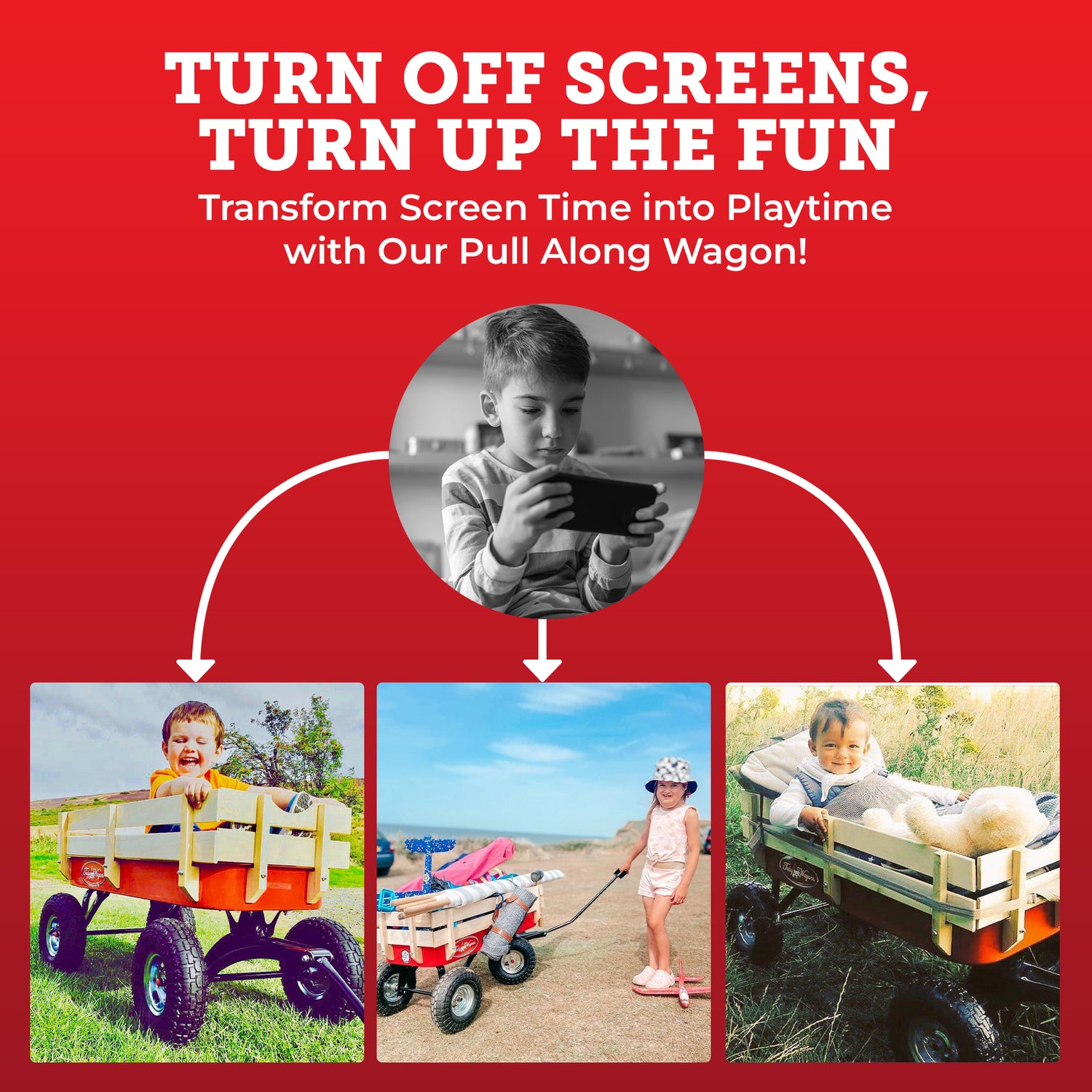 We at Toby Wagons believe that we need to get kids away from screens more and to encourage healthy outdoor adventure and to do that we must make it fun and our pull along wagon is perfect outdoor toy to encourage that. The priceless memories and invaluable life lessons your children will gain from unplugged, outdoor playtime are truly beyond measure in these days of constant technology